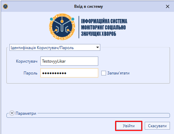Після запуску ІС СЗХ (далі - система), на першому кроці на формі «Вхід в систему» в поле «Користувач» необхідно ввести ЛОГІН, в поле «Пароль» - ПАРОЛЬ. Натиснути «Увійти».