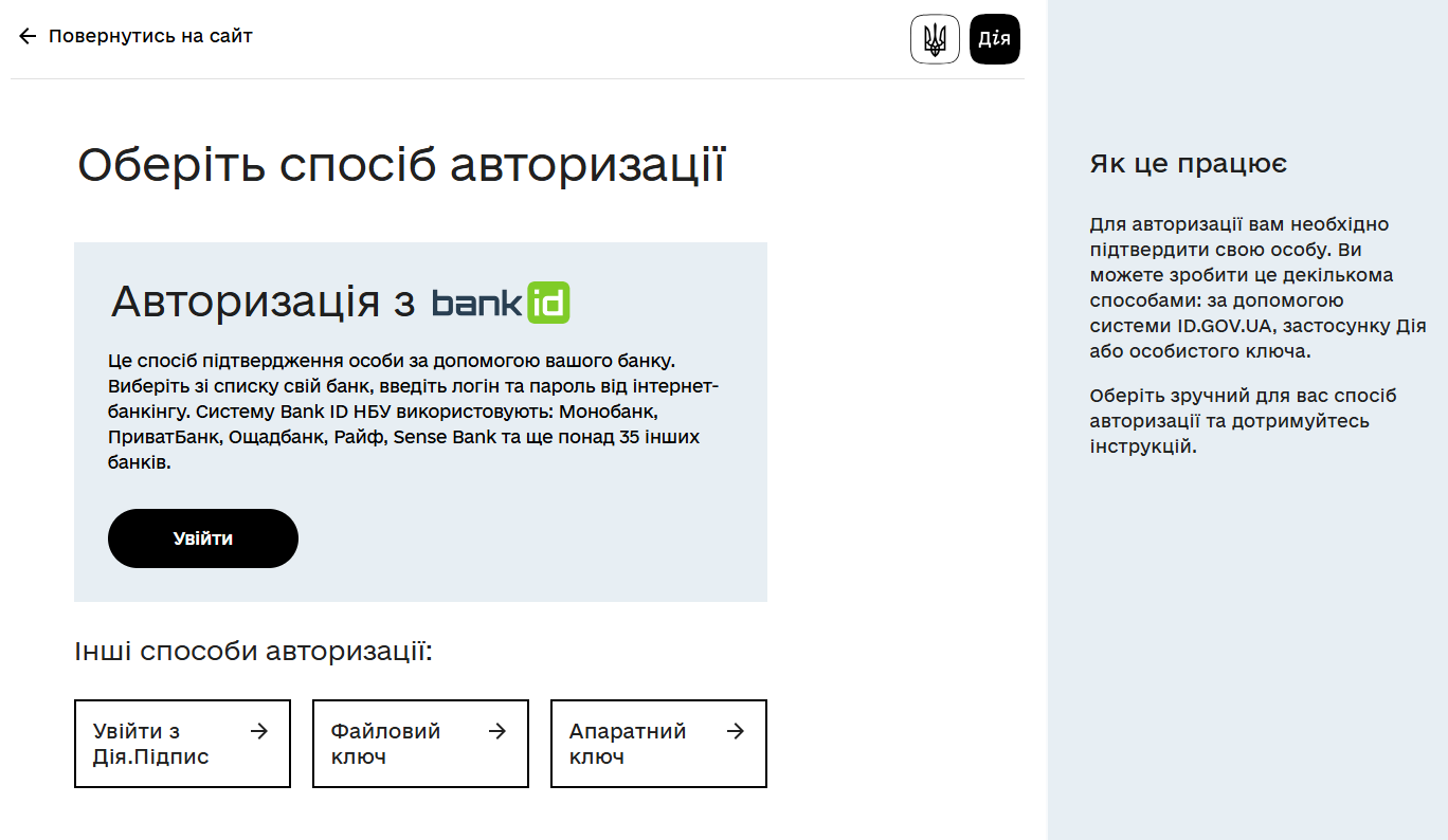 Система автоматично перенаправить користувача на офіційний ресурс: https://id.gov.ua/ua