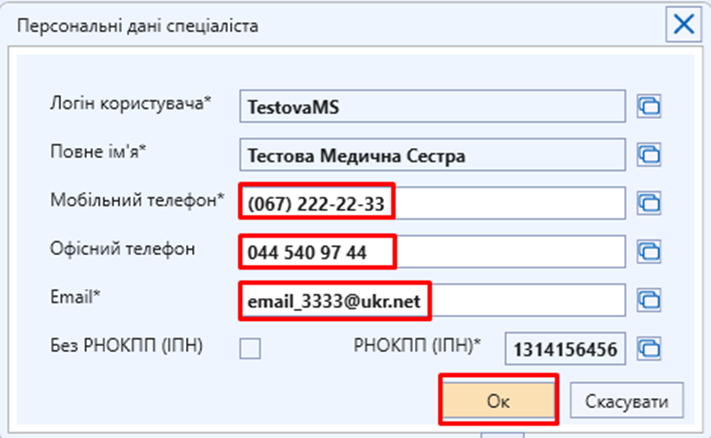 За необхідності користувач може змінити ті дані на картці, які редагуються: Мобільний телефон, Офісний телефон та Email. Після редагування натиснути «Ок» для збереження даних: