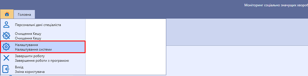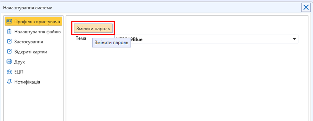 Якщо користувач хоче самостійно змінити свій пароль, необхідно обрати відповідний пункт «Налаштування» в лівому верхньому куті системи: