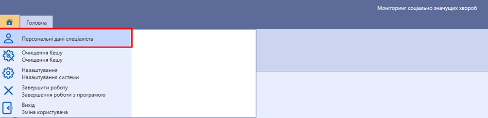 Для перегляду або редагування спеціалістом/користувачем ІС СЗХ персональних даних, необхідно обрати відповідний пункт «Персональні дані спеціаліста» в лівому верхньому куті системи: