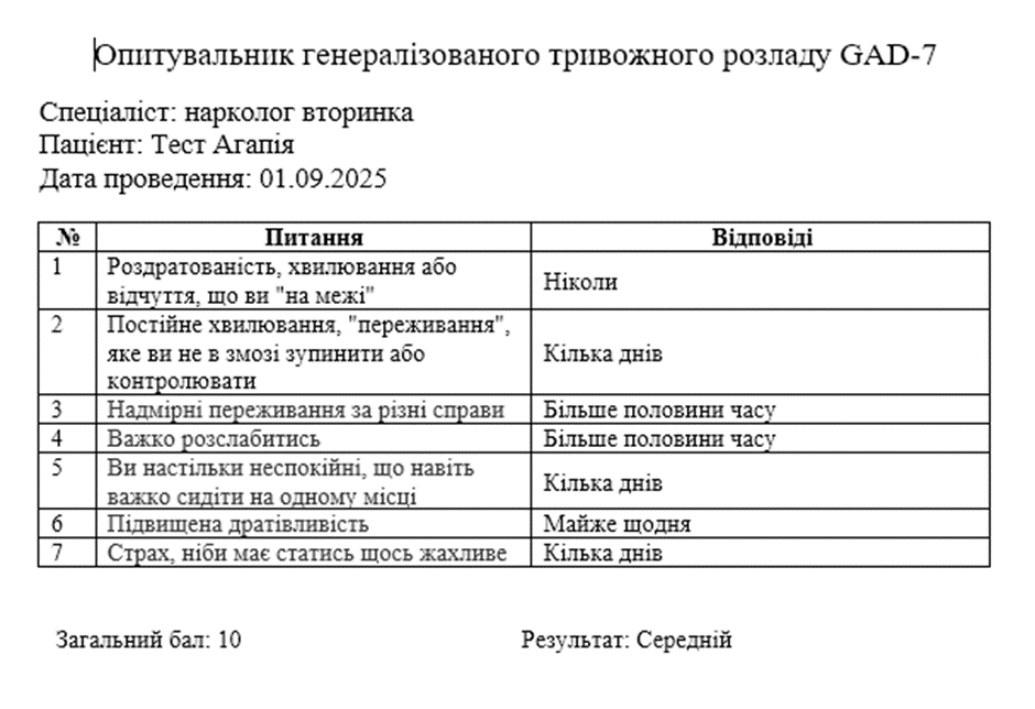 11. Реалізовано картку та друковану форму «Опитувальник генералізованого тривожного розладу GAD-7»