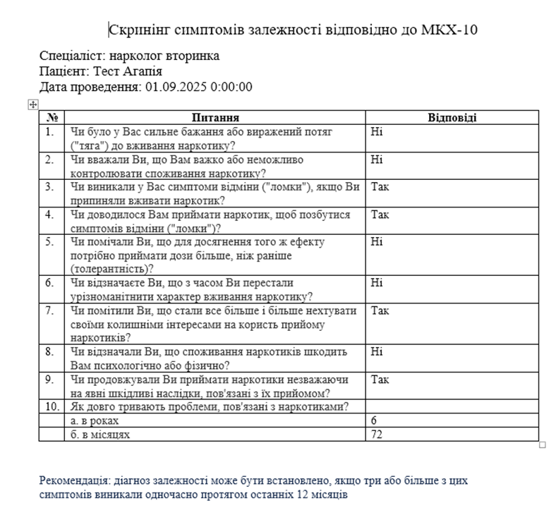 12. Реалізовано картку та друковану форму «Скринінг симптомів залежності відповідно до МКХ-10»