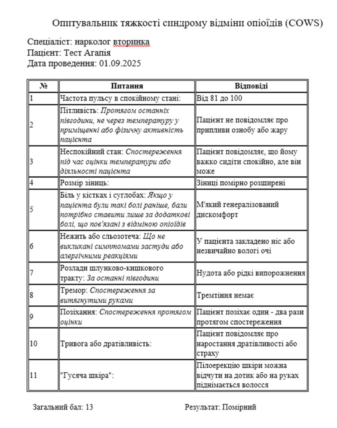 10. Реалізовано картку та друковану форму «Опитувальник тяжкості синдрому відміни опіоїдів (COWS)»